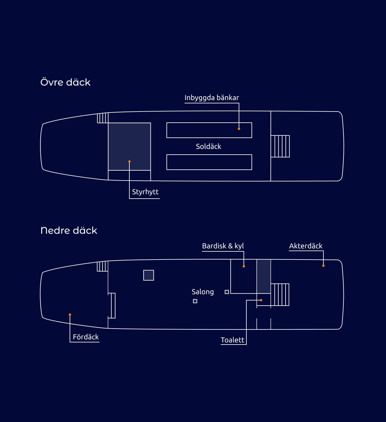 M/S Strandpilen är utrustad med allt ni behöver för en lyckad tur, inklusive ett rymliga soldäck perfekt för mingel och avkoppling. Våra professionella besättningsmedlemmar ser till att er resa blir både säker och njutbar.